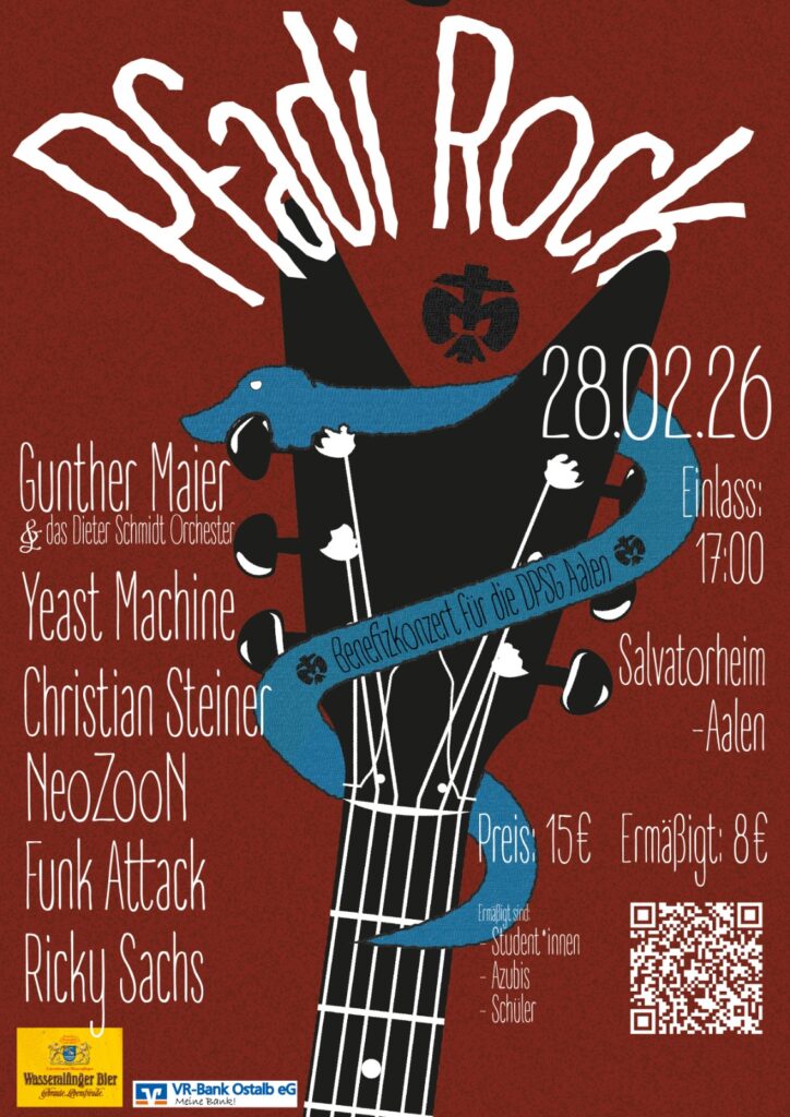 Weiter geht’s am 28.2.26 in Aalen im Salvatorheim. Ein Benefiz-Konzert mit YeastMachine, Gunther Maier & das Dieter Schmidt Orchester und Funk Attack. Eintritt 15€ bzw. 8€ ermäßigt. Wir starten um 20 Uhr, das Event beginnt schon um 16 Uhr. Alles für einen guten Zweck – nix bleibt hängen…